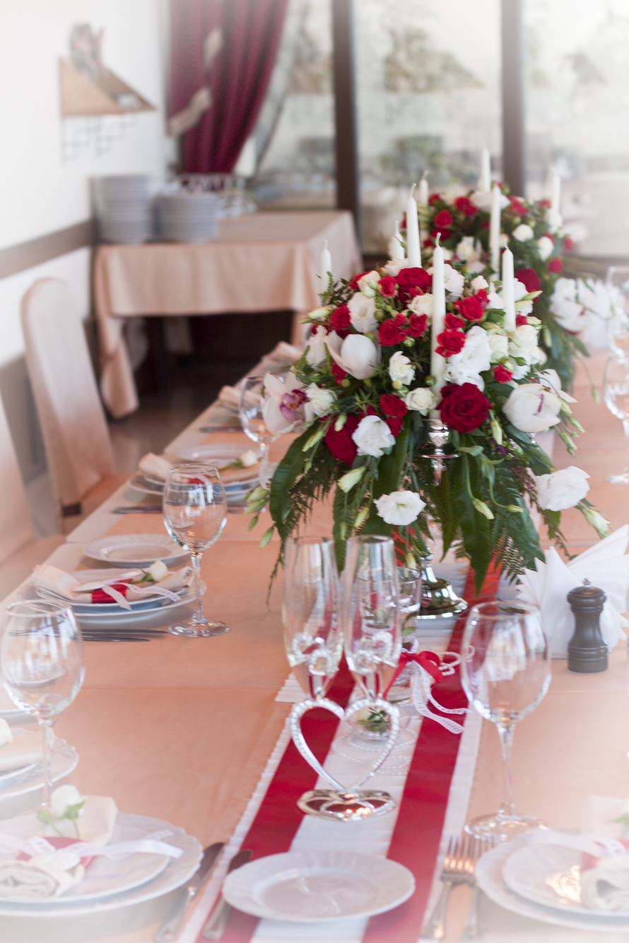 - оформить место празднования (ресторан, кафе, особняк), включая флористическое оформление интерьеров, настольные композиции, стол жениха и невесты и прочее;